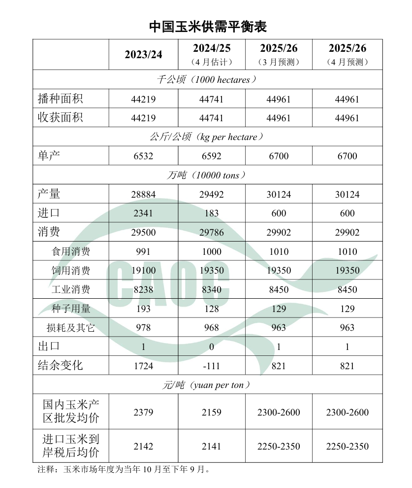 农业农村部发布4月供需报告,本月对中国玉米供需形势预测与上月保持一致。今年春季东北气温偏高,墒情整体较好,玉米春播可能较常年提前。玉米主产区售粮进度超过八成,市场售粮主力由农户转向贸易商。生猪存栏量处于高位,饲用需求旺盛,但生猪养殖亏损加剧,叠加饲用和深加工企业原料库存增加、采购谨慎,玉米价格略有回落。